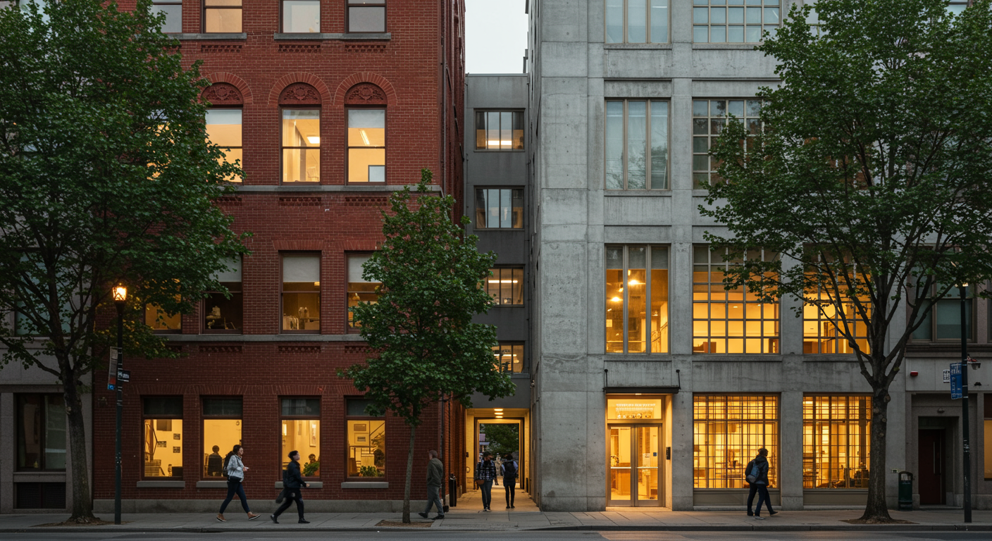The Residences: The historic buildings feature factory-era high ceilings from 10’ to 12’, new energy efficient windows, white oak flooring and original details of the exposed concrete and brick and timber structures. Designer kitchens feature custom RiFRA Italian kitchens with Miele refrigerator, oven, dishwasher, cooktop and microwave. Penthouse kitchen designs are unique and include additional speed ovens and built-in wine fridge. Porcelain stone countertops sit on top of a monolithic oak wood island with an integrated sink. Master baths feature a hand clipped stone mosaic floor, large format porcelain tile on the walls, double showers, and vanities with a continuous shelf detail that runs from the shower to the sink area. Select Penthouse residences also feature freestanding tubs.