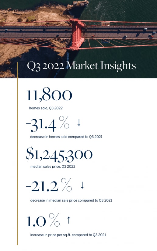 Our Q3 market report has arrived. While the housing market slowed during the third quarter the Bay Area real estate market fared better than most of the country. Insights for the quarter include; indicators of economic strength in the labor market amid a slowing housing market, sales totals drop from all-time record highs in the previous quarter (~15K to ~12K), demand remained strong particularly at the lower end of the market (~$1M) while signs of slowing demand in the higher end (over $3.5M). Higher mortgage rates and economic uncertainty has eased buyer competition, homes in the $2M-$3M range were selling in under two weeks earlier in the year, and by September were selling in nearly a month. Have questions or want to learn more, contact us anytime, we're here to help.